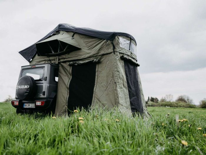 El avance Arcta Viator 140 pro puede fijarse fácilmente a la tienda de techo Viator 140 pro mediante una cremallera. Este avance puede fijarse a la tienda de techo a una altura de 190 cm. De este modo se crea en un abrir y cerrar de ojos, un vestíbulo totalmente protegido y espacio adicional para guardar el equipaje.