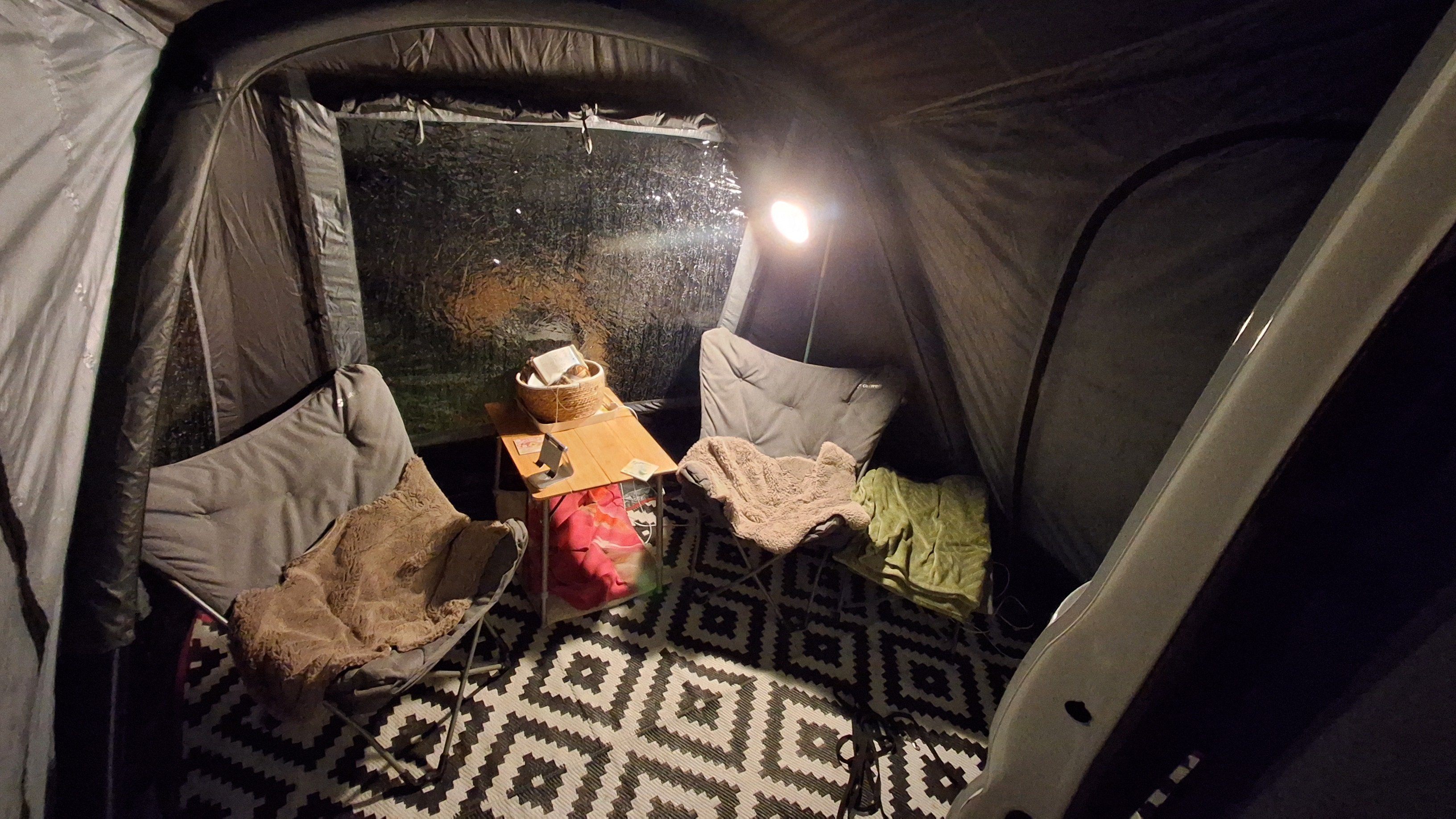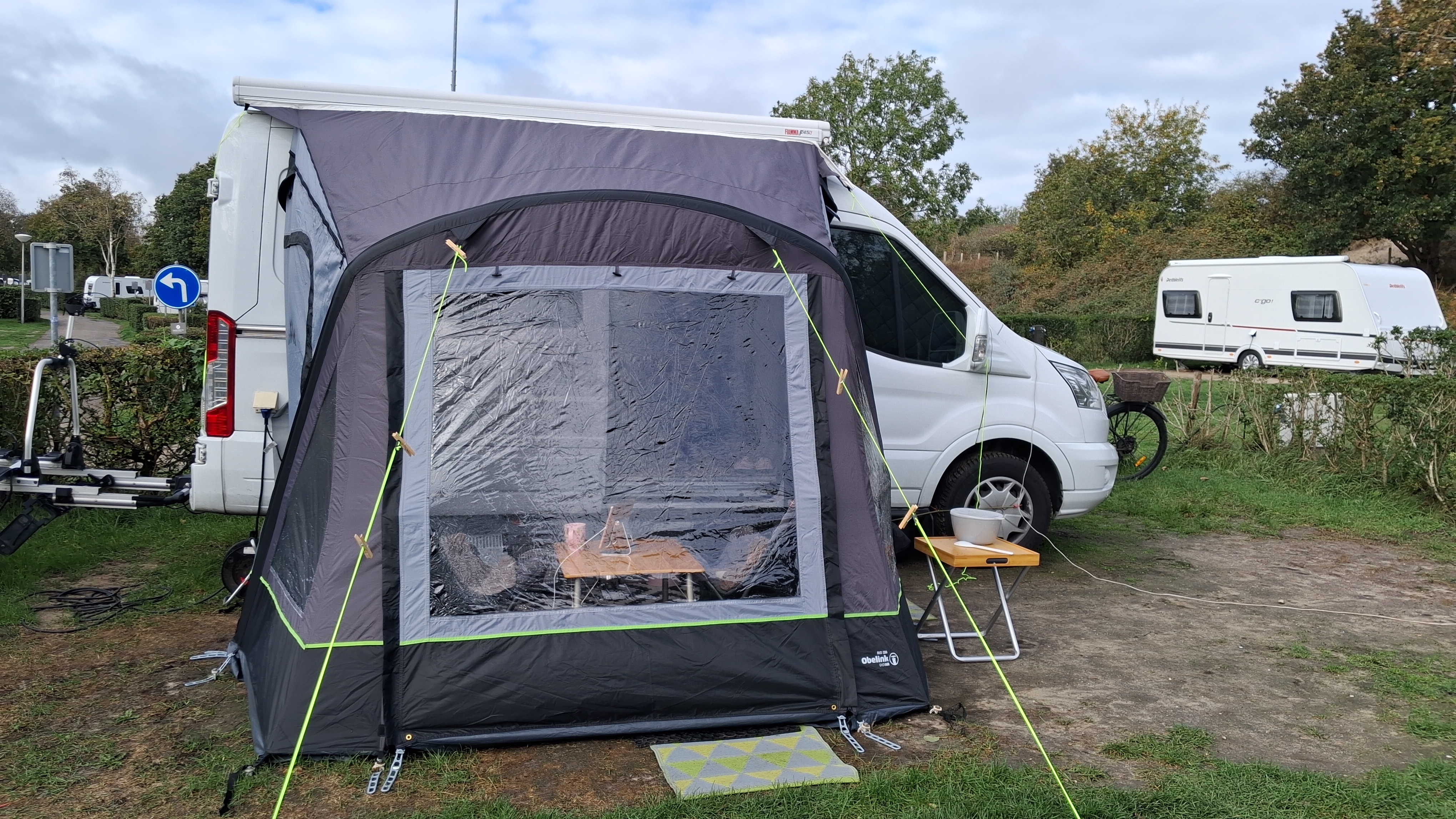 Utilice el Rio 280 como porche cubierto delante de la puerta de la caravana o autocaravana o como avance compacto con dos sillas y una pequeña mesa.
