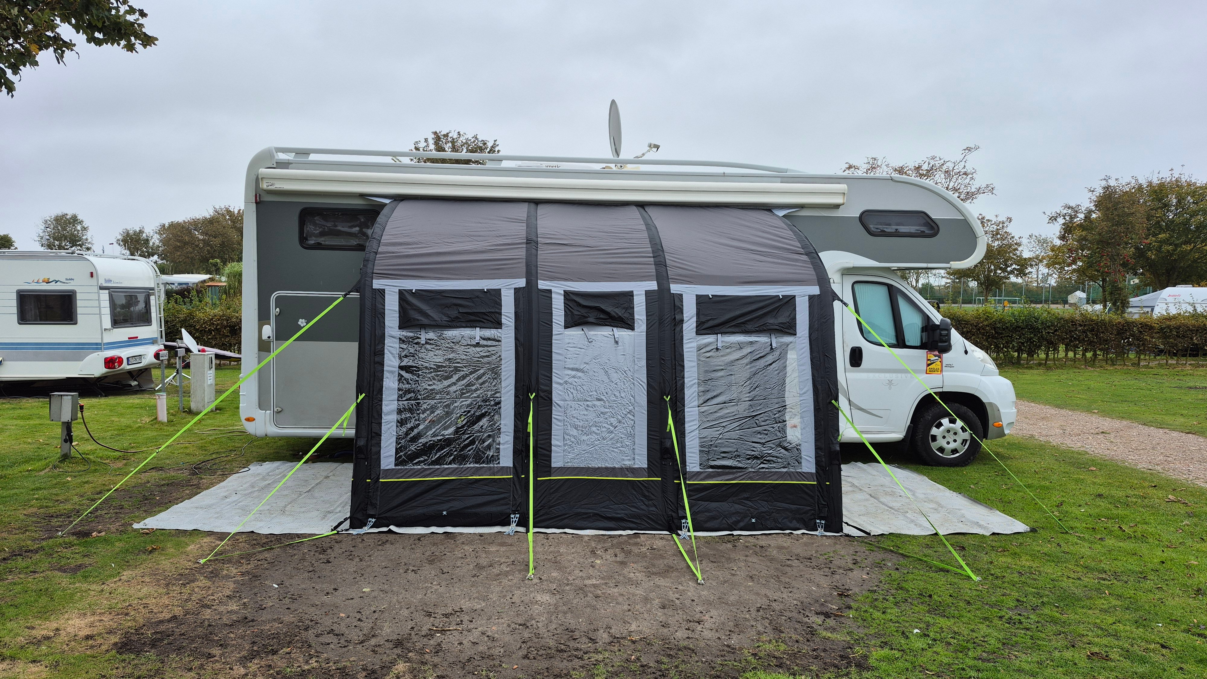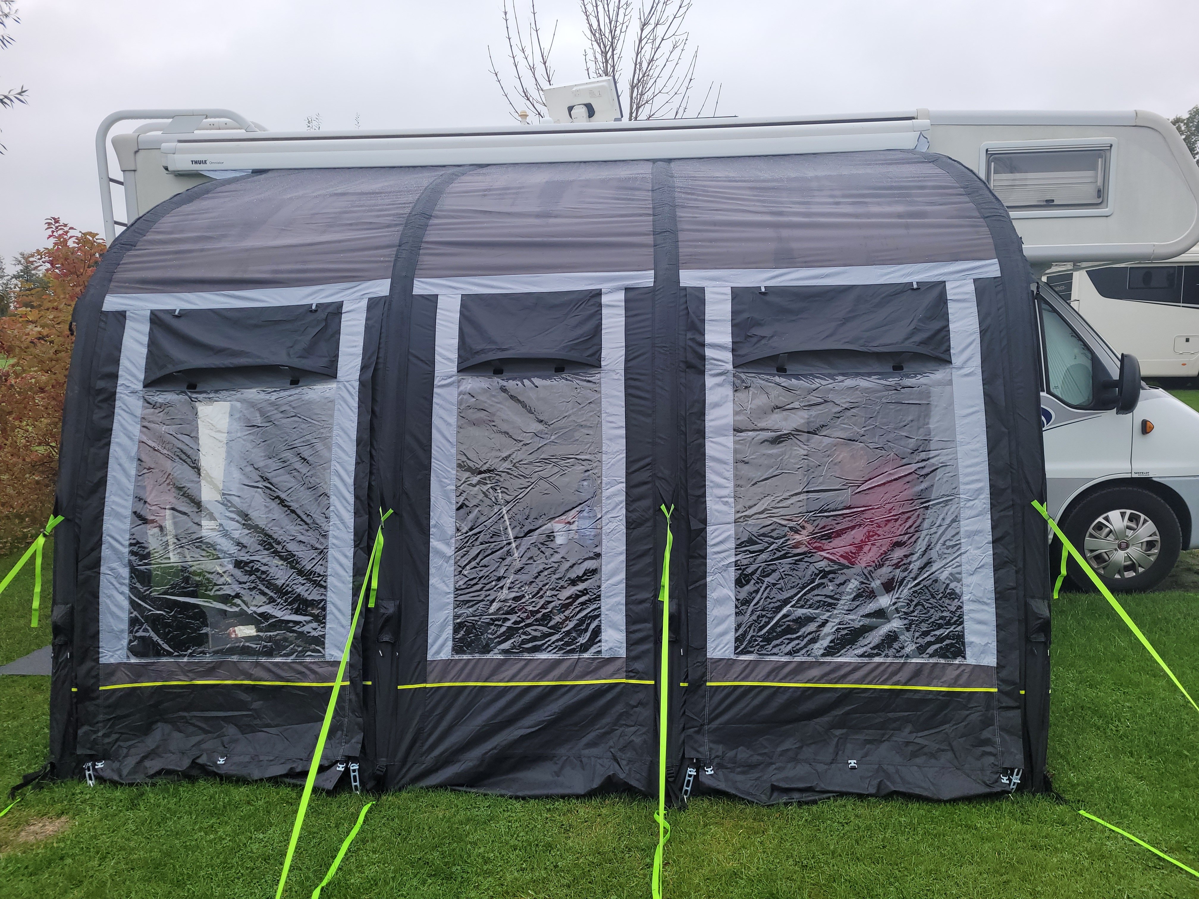 - Empfehlenswertes VorzeltWir sind mit dem aufblasbaren Vorzelt (390 x 250 cm sehr zufrieden! Der Aufbau ist wirklich einfach und geht schnell – in unserem dreiwöchigen Einsatz haben wir es viermal problemlos auf- und abgebaut. Auch bei Regen hat das Zelt dicht gehalten und es ist windstabil. Zusätzliche Airtubes zur Dachstabilisierung halten wir nicht für erforderlich. Besonders praktisch finden wir die Möglichkeit, die Vorderfront am linken und rechten Fenster komplett zu öffnen, was für viel Luft und ein offenes Raumgefühl sorgt (das mittlere Fenster bleibt fest). Für uns bedeutet dieses Vorzelt eine deutliche Vergrößerung unseres Wohnmobils und vor allem mehr Komfort – darauf möchten wir nicht mehr verzichten. Einziger kleiner Kritikpunkt sind die mitgelieferten Heringe, hier haben wir uns für stabilere entschieden. Insgesamt aber ein sehr gutes Vorzelt, das wir uneingeschränkt weiterempfehlen können.