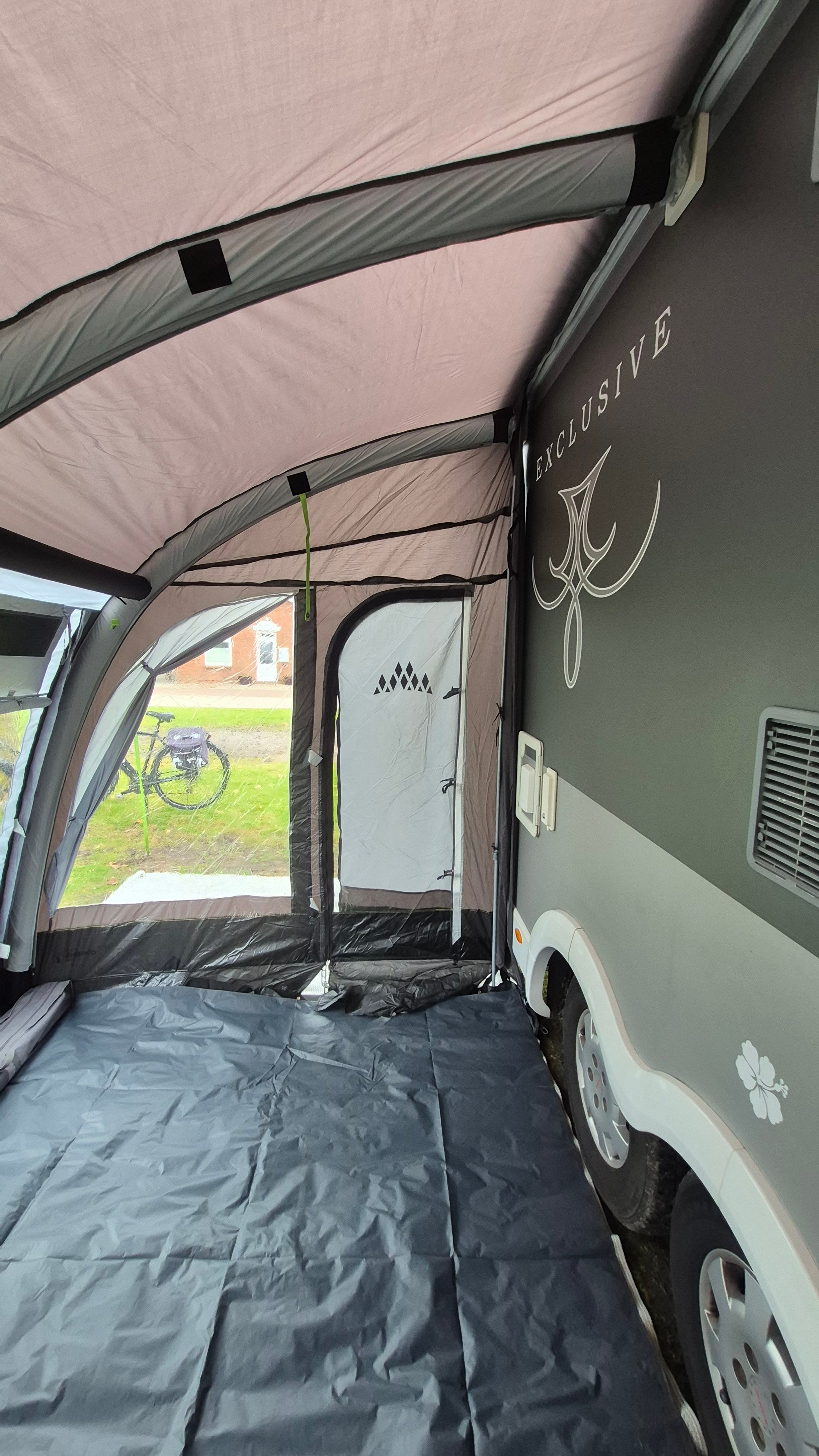 Con su profundidad de 250 cm, el Palma Easy Air es el avance perfecto para viajar. El Palma 390 Easy Air está equipado con grandes ventanas que proporcionan mucha luz y una sensación de amplitud. Las ventanas se pueden cubrir completamente desde el interior con las solapas integradas. También se ha tenido en cuenta la ventilación, ya que hay 2 grandes aberturas de ventilación en el frontal que pueden permanecer abiertas incluso con mal tiempo. Ambas puertas laterales están equipadas con una puerta de gasa.