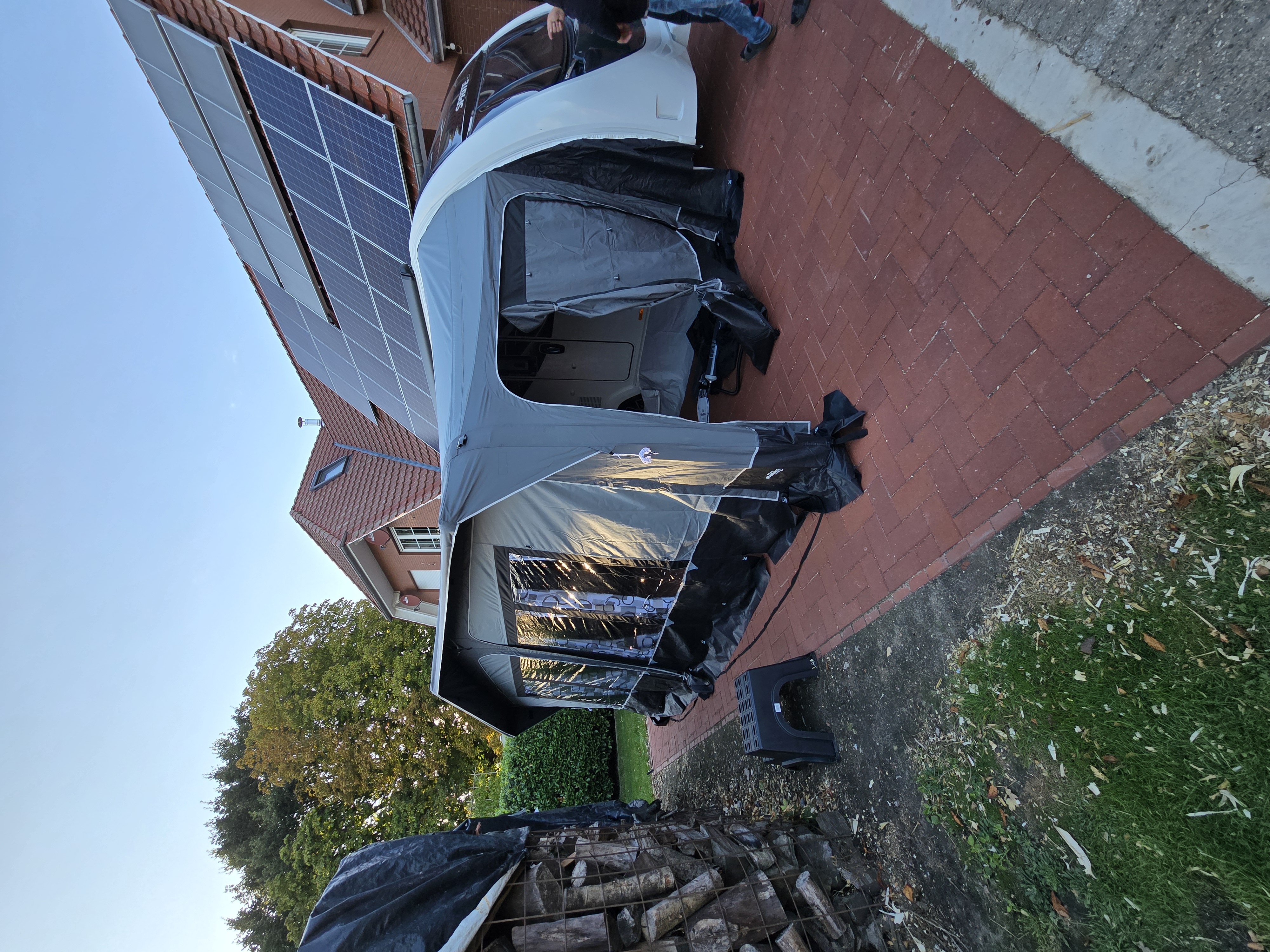Todos los paneles se pueden cerrar con cremallera. Esto también le permite utilizar el techo como toldo en los calurosos días de verano. Como todos los paneles se pueden enrollar un poco, se puede entrar en el avance por 4 puntos. Ambos laterales tienen ventanas que son mitad gasa y mitad lámina para ventanas. Las grandes ventanas proporcionan mucha luz y se pueden cubrir desde el interior con las cortinas suministradas. Para mayor ventilación, hay una rejilla de ventilación en la parte más alta que se puede cerrar fácilmente con una cremallera.