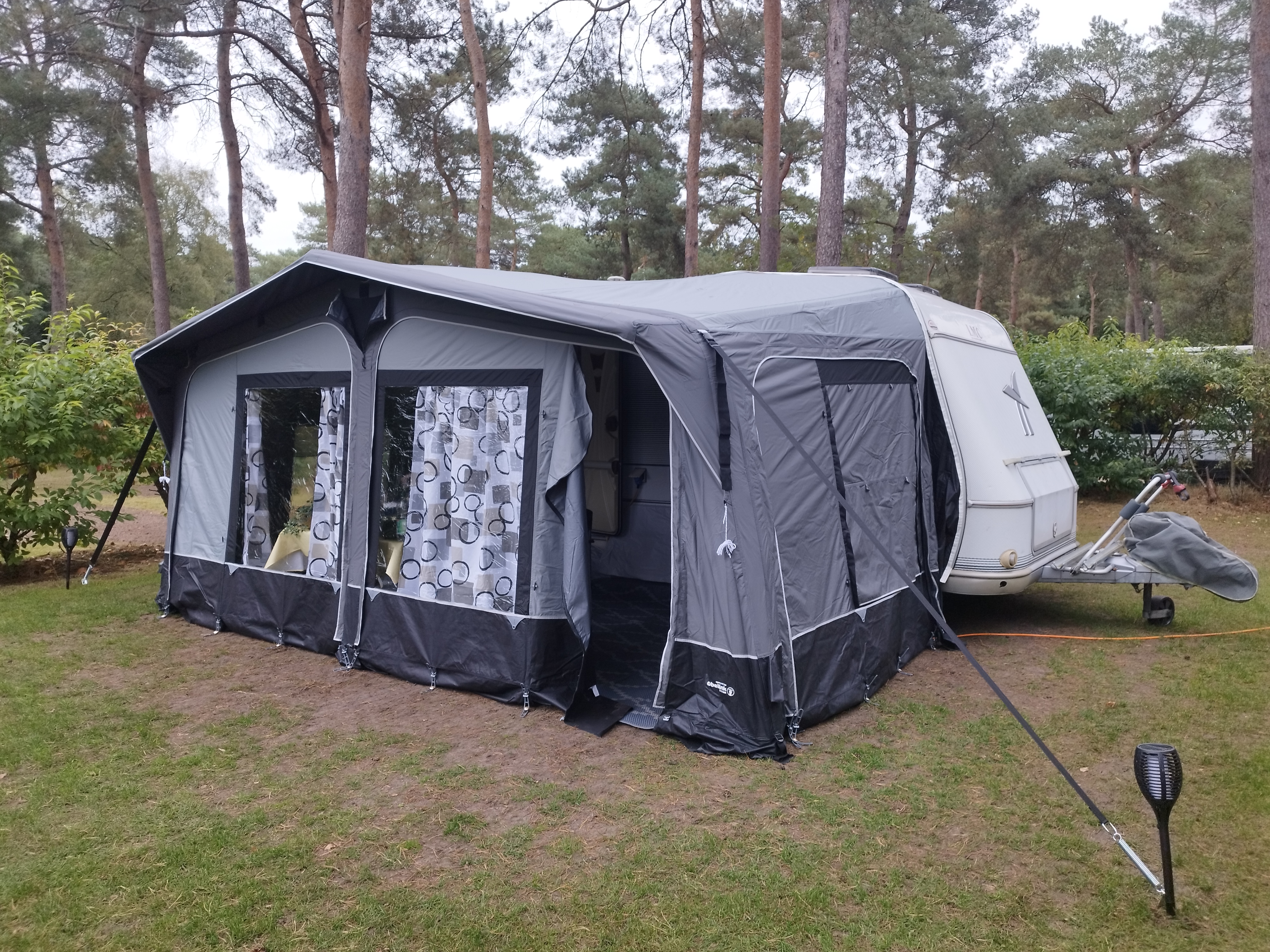Todos los paneles se pueden cerrar con cremallera. Esto también le permite utilizar el techo como toldo en los calurosos días de verano. Como todos los paneles se pueden enrollar un poco, se puede entrar en el avance por 4 puntos. Ambos laterales tienen ventanas que son mitad gasa y mitad lámina para ventanas. Las grandes ventanas proporcionan mucha luz y se pueden cubrir desde el interior con las cortinas suministradas. Para mayor ventilación, hay una rejilla de ventilación en la parte más alta que se puede cerrar fácilmente con una cremallera.