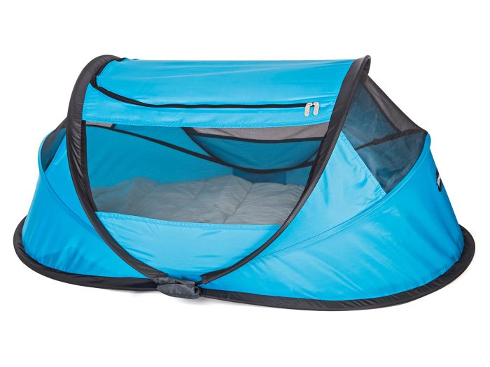 El Deryan Babybox en el color azul es una cama de viaje pop-up compacta en una tienda de campaña, adecuada para niños de 0 a 2,5 años de edad.