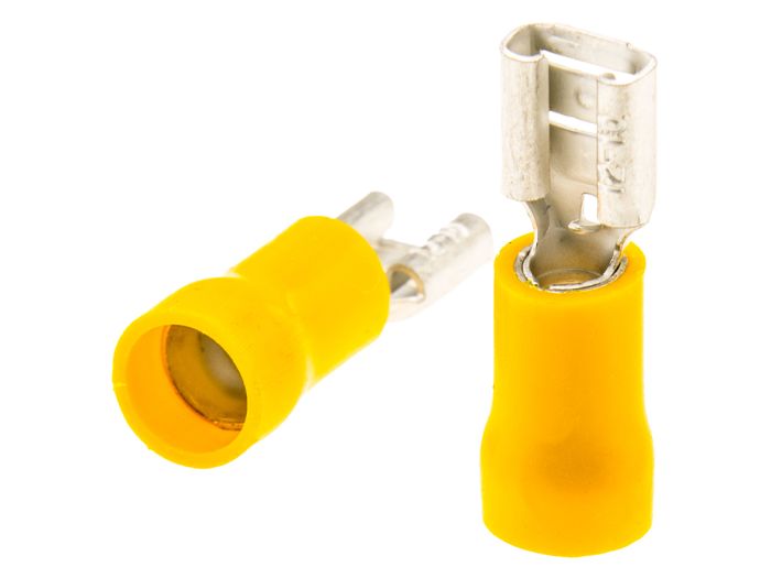 El enchufe hembra plano de color amarillo es adecuado para grosores de cable de 2,5 hasta 6 mm². El terminal de cable, se utiliza ampliamente en la ingeniería eléctrica y se puede montar fácilmente en un cable eléctrico. El enchufe hembra está disponible en varios modelos.