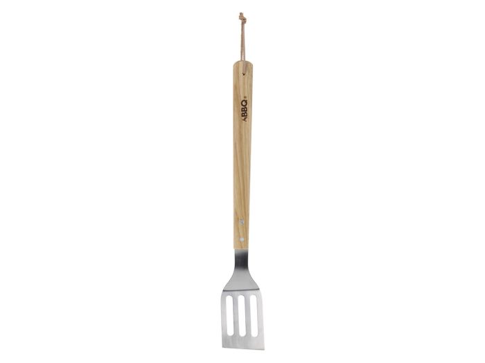 Esta espátula para barbacoa de 46 cm es de acero inoxidable con mango de madera.