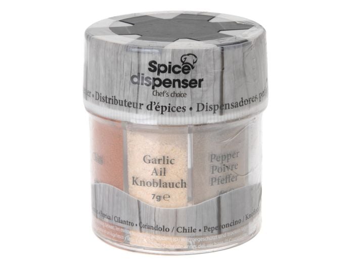 Este especiero con 6 compartimientos está equipado con 6 especias diferentes, ideal cuando se acampa para no tener que llevar varios frascos de especias. Cada condimento tiene su propio compartimento para una correcta dosificación.