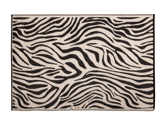 Vista su terraza, tienda o avance con la alfombra de exterior con estampado de cebra de Esschert Design.