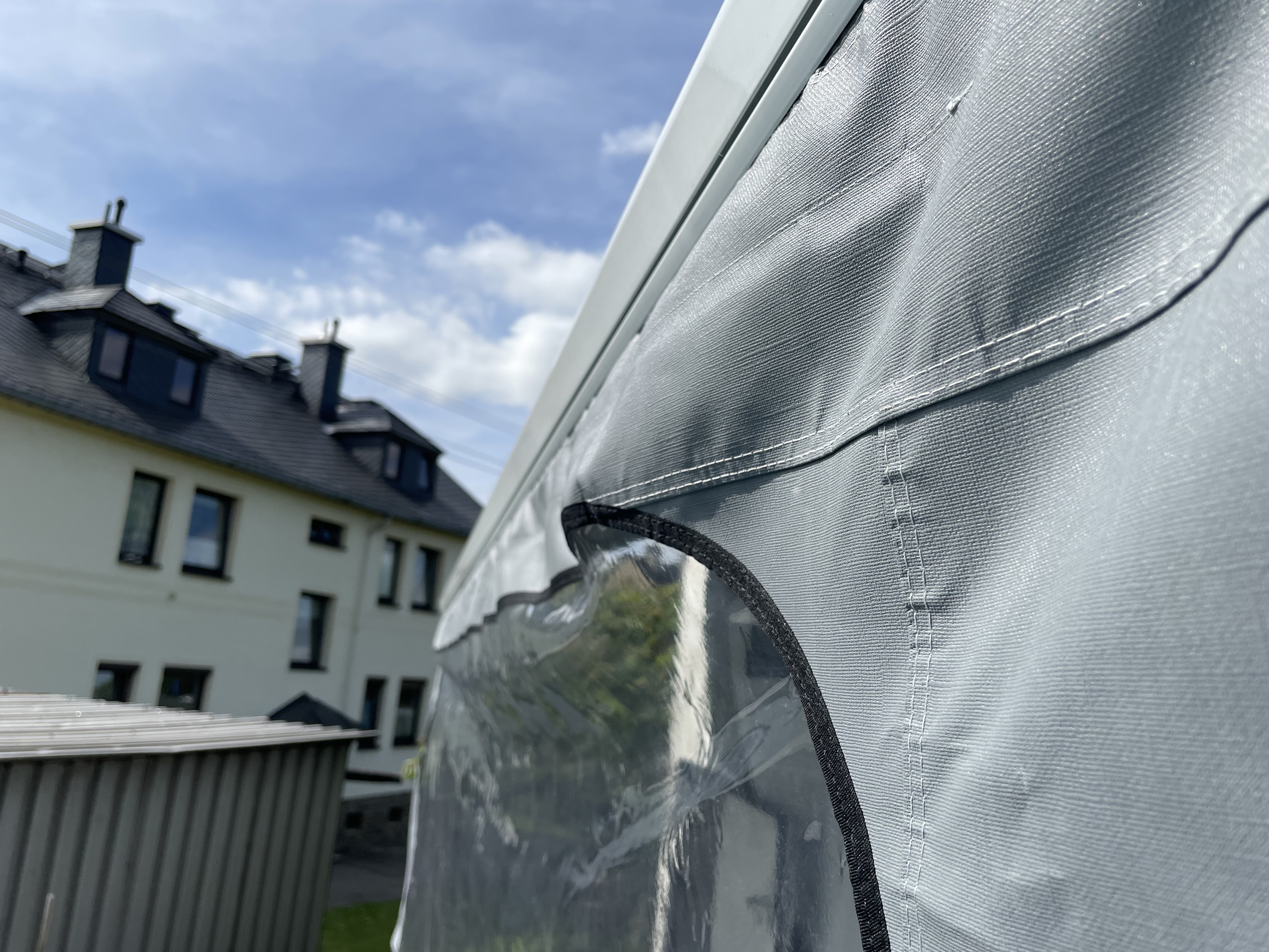 Pared frontal con una gran ventana de cristal y extensión de vinilo hasta el suelo. Proporciona más privacidad y protección contra el viento. Vinilo lavable que no se pudre y con protección UV. Fácil de montar gracias a los elásticos y a las piquetas suministradas.