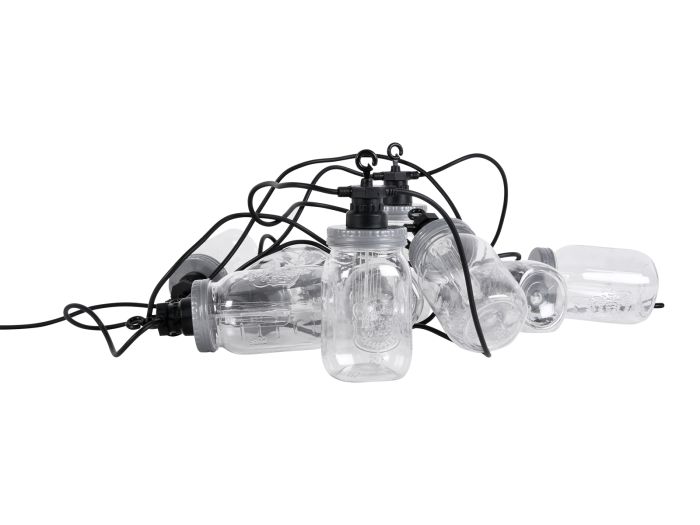Los 10 tarros de conserva de plástico están distribuidos en un cable de 4,5 m con un cable de alimentación de unos 3 m. Si una bombilla falla, las otras permanecen encendidas. Las bombillas LED no son reemplazables.