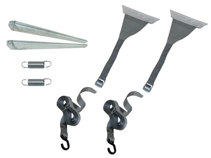 Las piquetas suministradas fijan firmemente las cinchas antitormenta en el suelo. Coloque muelles entre la cincha antitormenta y la piqueta para absorber los golpes que producen las ráfagas de viento y evitar daños en el toldo o en la propia cincha.