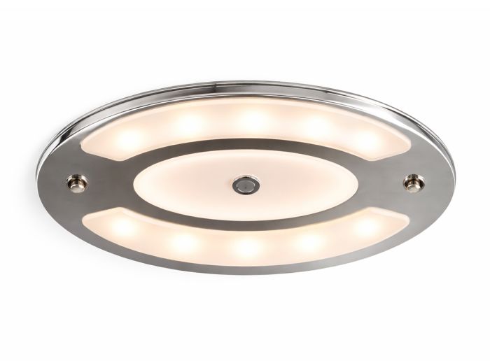 La lámpara plafón LED es una lámpara de techo ovalada que funciona a 12 voltios. Debido a su color aluminio/plata, puede ser utilizada en cualquier interior. La lámpara es regulable con control táctil.