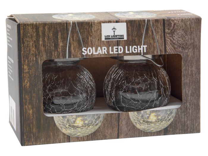 La bola craquelada transparente está hecha de vidrio con un sistema colgante de acero inoxidable y un panel solar acoplado. Las luces emiten una cálida luz blanca y funcionan con 1,2 V.