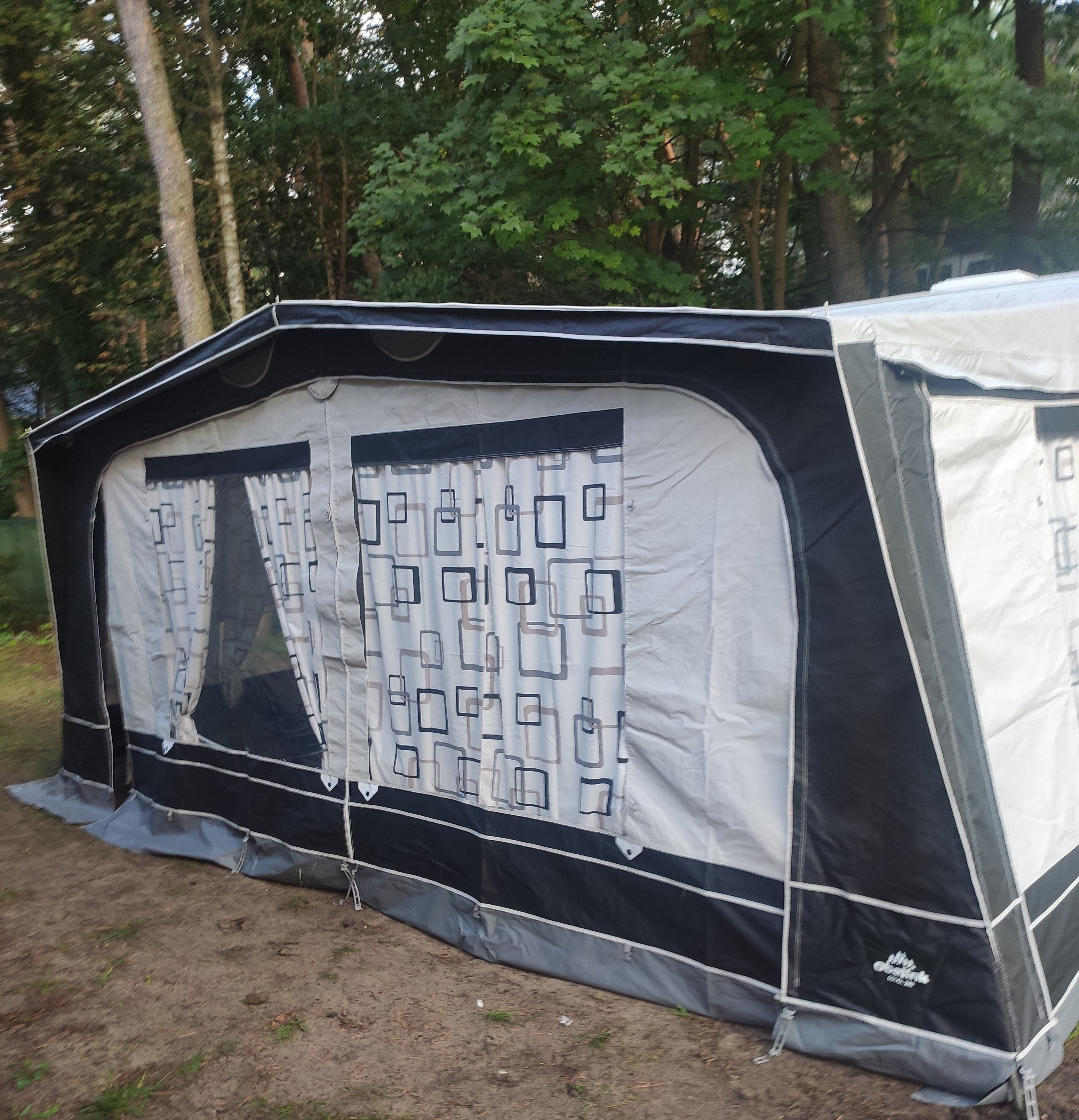 Para mayor comodidad se puede poner un anexo en la parte derecha. Por ejemplo, para cocinar o para tener espacio extra o para tener dos sitios adicionales en los que dormir. Con el set de cinchas antitormenta que puede adquirir puede asegurar su avance en caso de que haya fuertes ráfagas de viento.