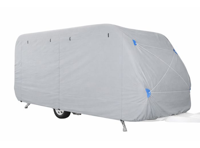 La cubierta para caravanas tiene una anchura de 235 cm y está disponible en varias longitudes. Esta funda es impermeable y adecuada para su uso tanto en interiores como en exteriores. Tiene 3 cremalleras en un lado que permiten entrar en la caravana mientras está aparcada. La cubierta de la caravana tiene una banda elástica en el dobladillo para asegurar un buen ajuste, 4 vientos tensores pasan por debajo de la caravana para mantenerla bien sujeta.