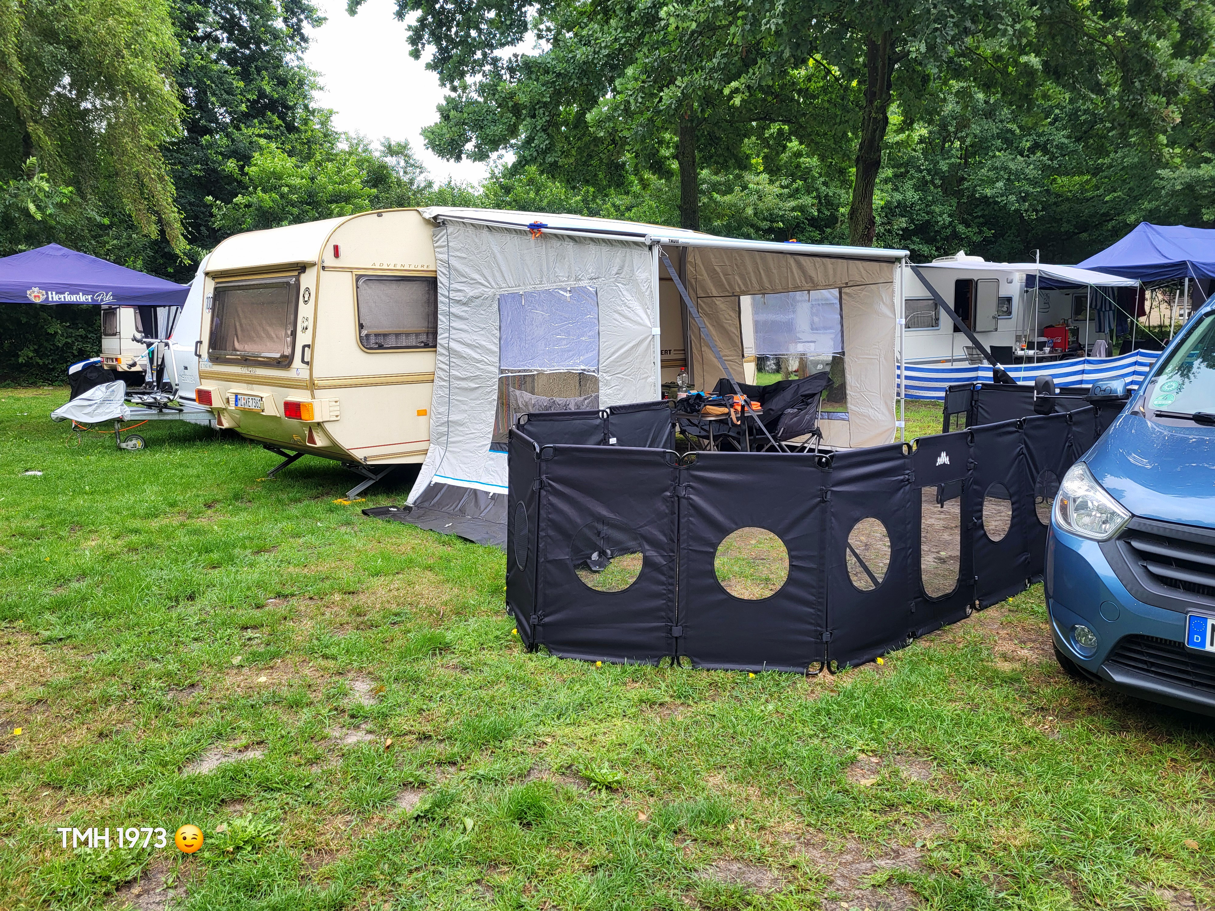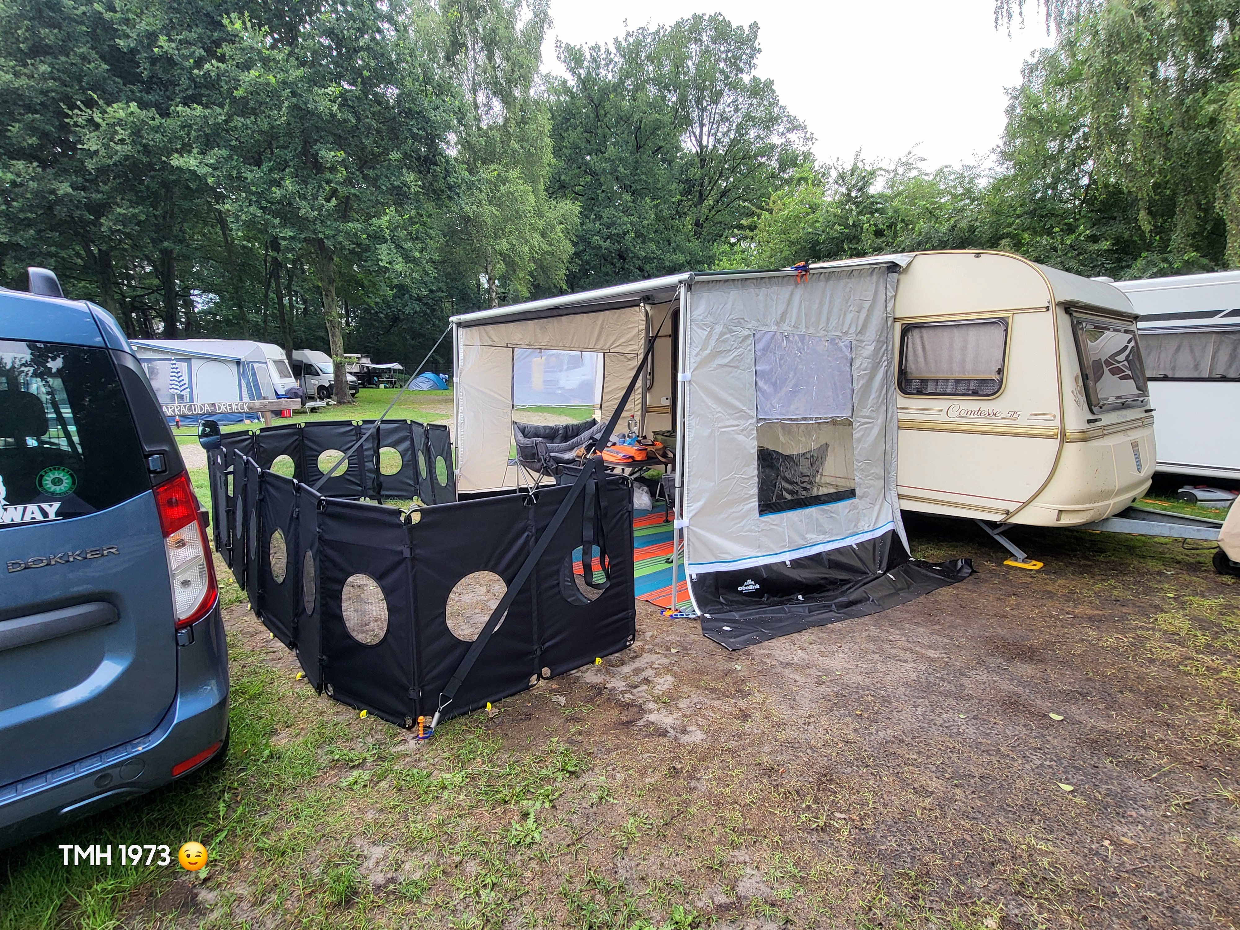 Además este cercado se puede ampliar con dos paneles extra para tener más espacio (estos se pueden adquirir por separado en la página web). En la foto, frente a la caravana, puede ver el Balou con el set de ampliación.