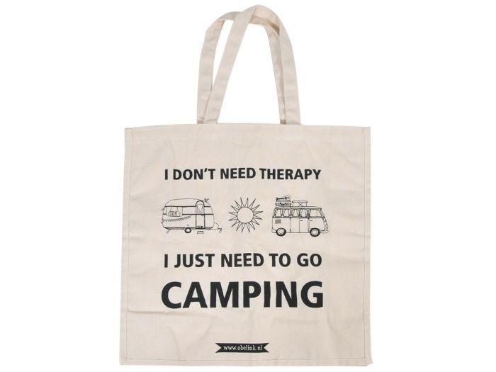 La bolsa de tela Obelink don't need therapy es una bolsa espaciosa con una divertida cita de camping.