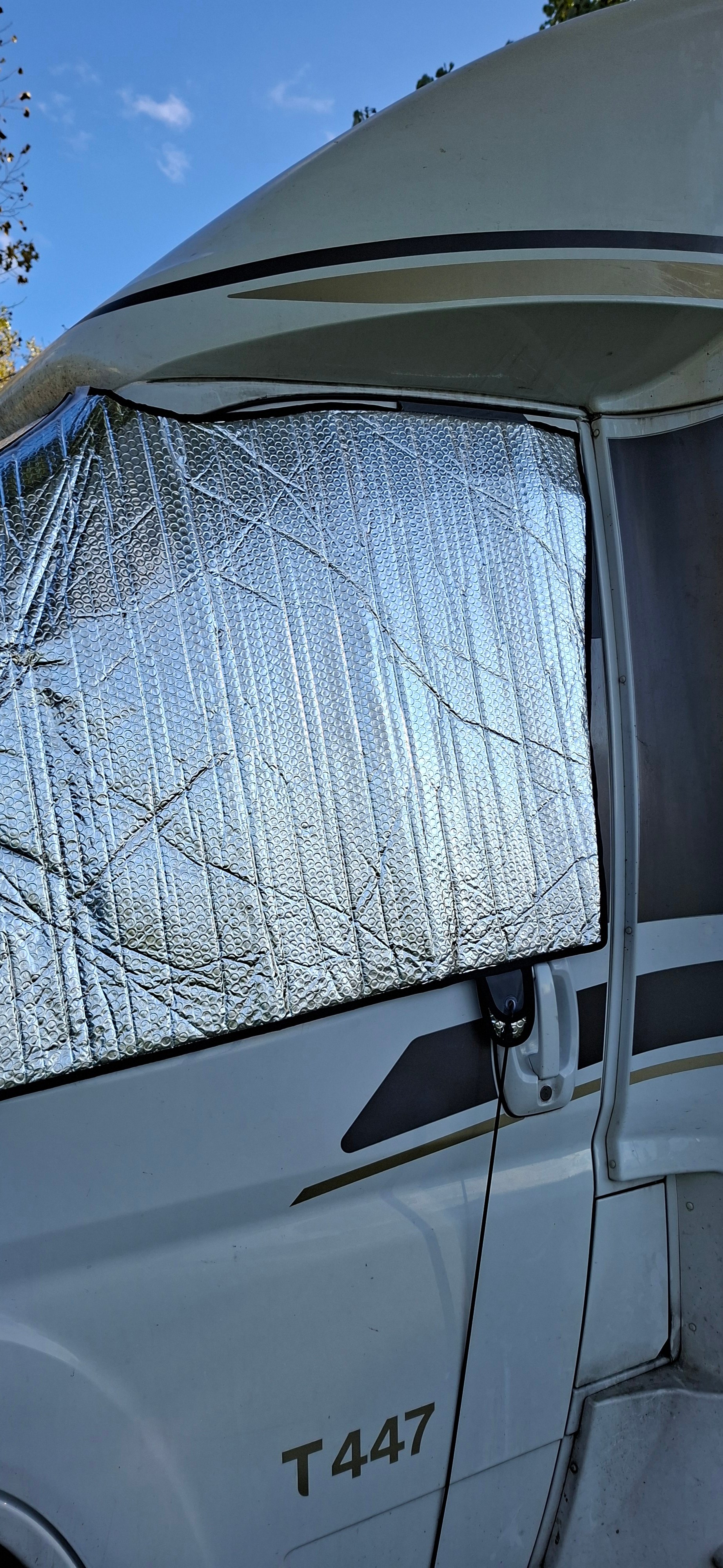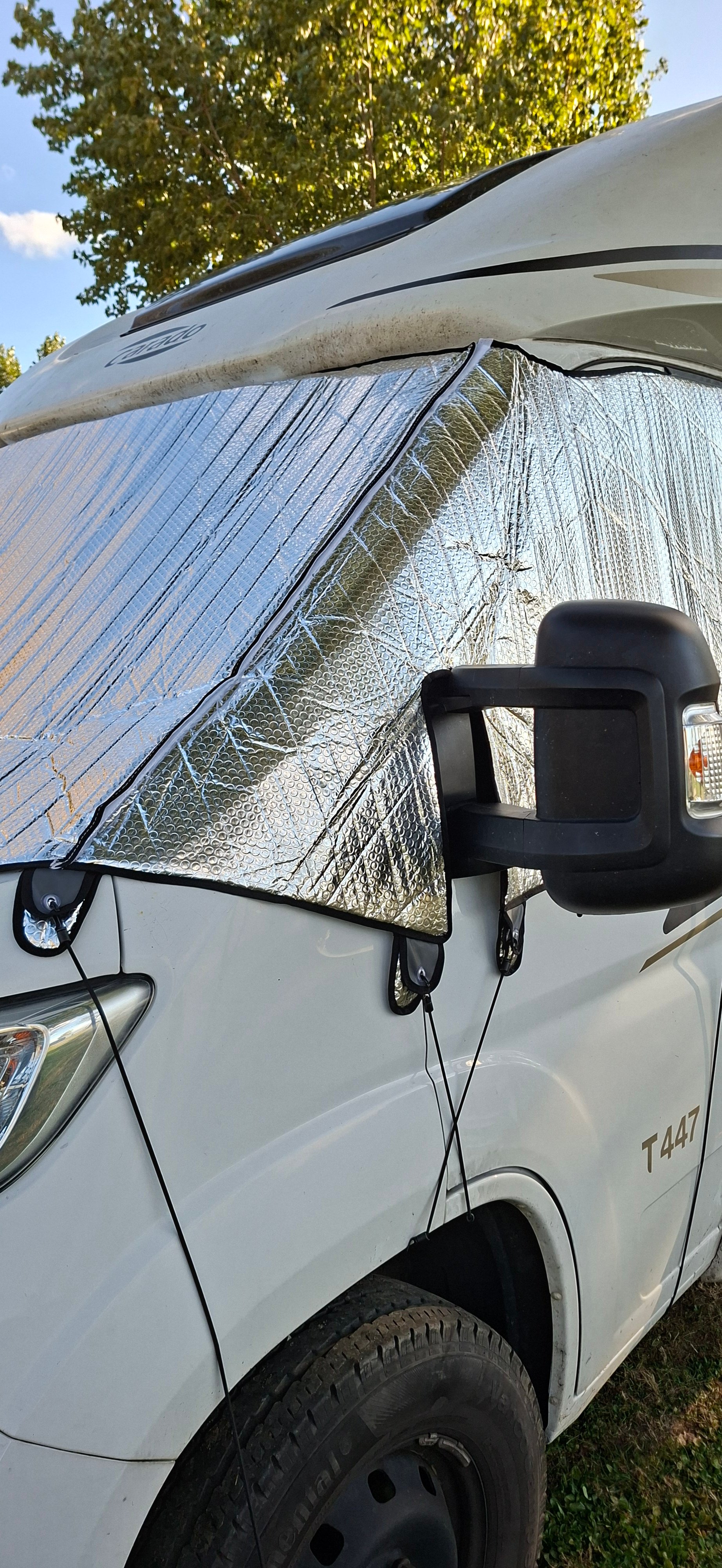 El parasol Obelink está especialmente diseñado para la Fiat Ducato desde 2006 y es fácil de instalar. Como el parasol está hecho a medida, sólo tiene que colgar las esquinas del aislamiento de la ventana en los bordes de las puertas. También se suministran cordones elásticos para facilitar aún más la colocación de las persianas.