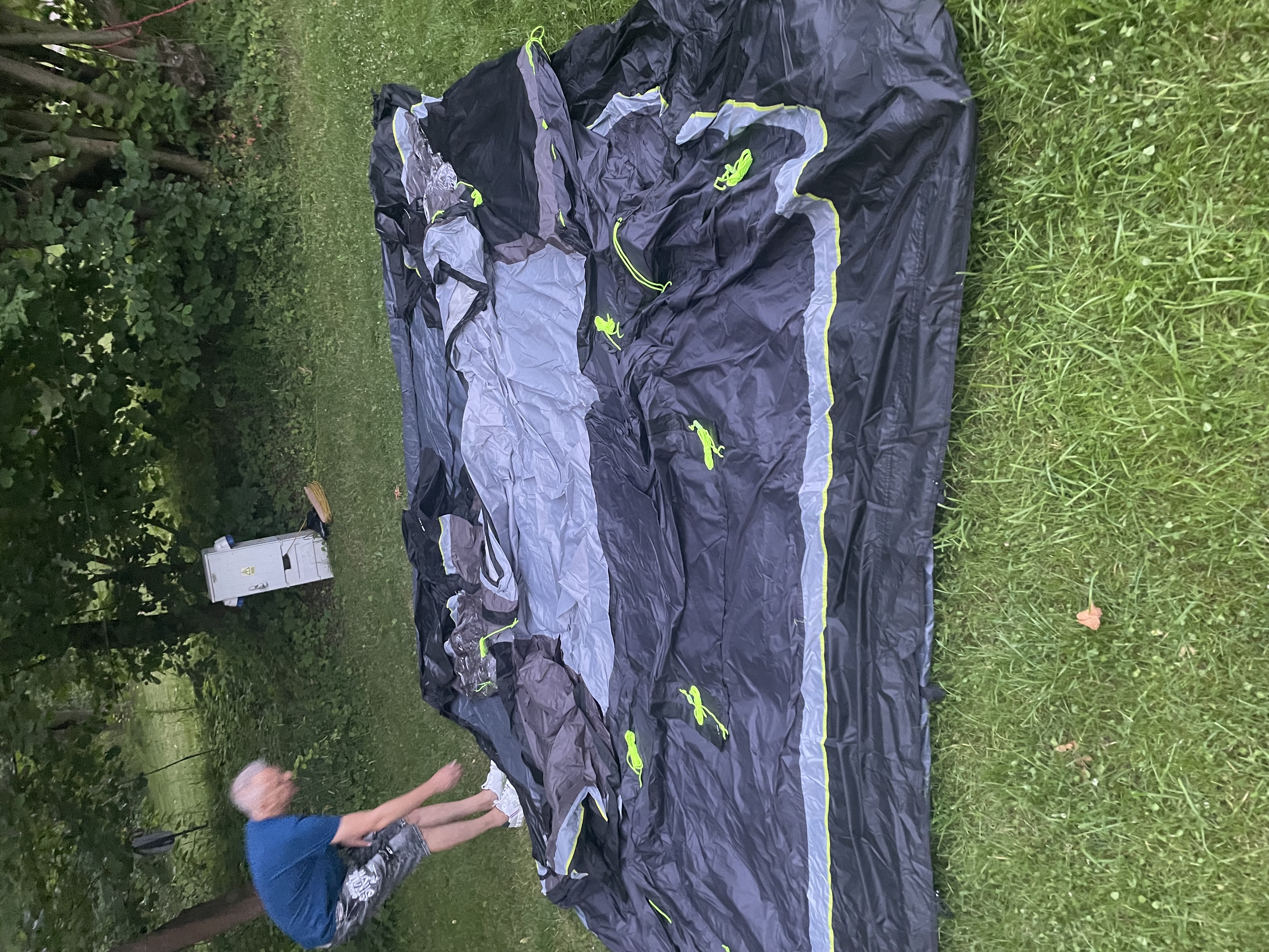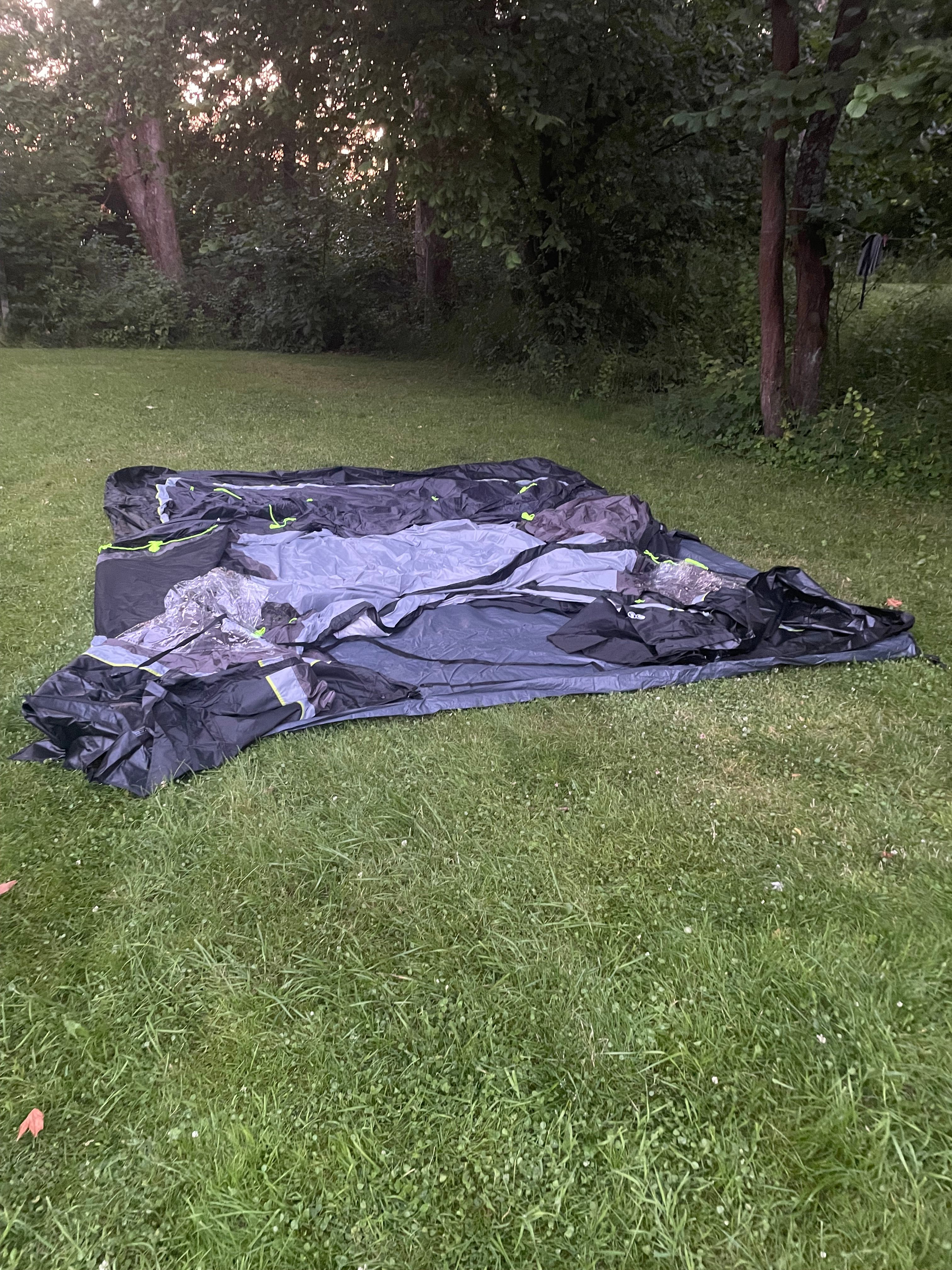 El espacioso toldo delantero tiene una pared frontal que se puede abrir. ¿No utiliza la pared frontal? Entonces puede guardarla en el práctico compartimento integrado. La pared frontal está dividida en dos mitades. La mitad izquierda tiene una gran ventana y la derecha, una gran mosquitera. La mitad con mosquitera se puede enrollar hasta la mitad. Esto crea una entrada espaciosa. Todas las ventanas pueden cubrirse desde el interior con una solapa oscurecedora. Estas solapas se pueden cerrar fácilmente con cremalleras. Así puede jugar usted mismo con la privacidad y la luz. Para el toldo, se suministra un suelo de PE separado, para que las cosas que quiera poner debajo del toldo no acaben directamente sobre la hierba. ¿Quiere sentarse cómodamente con los pies sobre la hierba? Entonces, por supuesto, puede elegir no utilizarlo.
