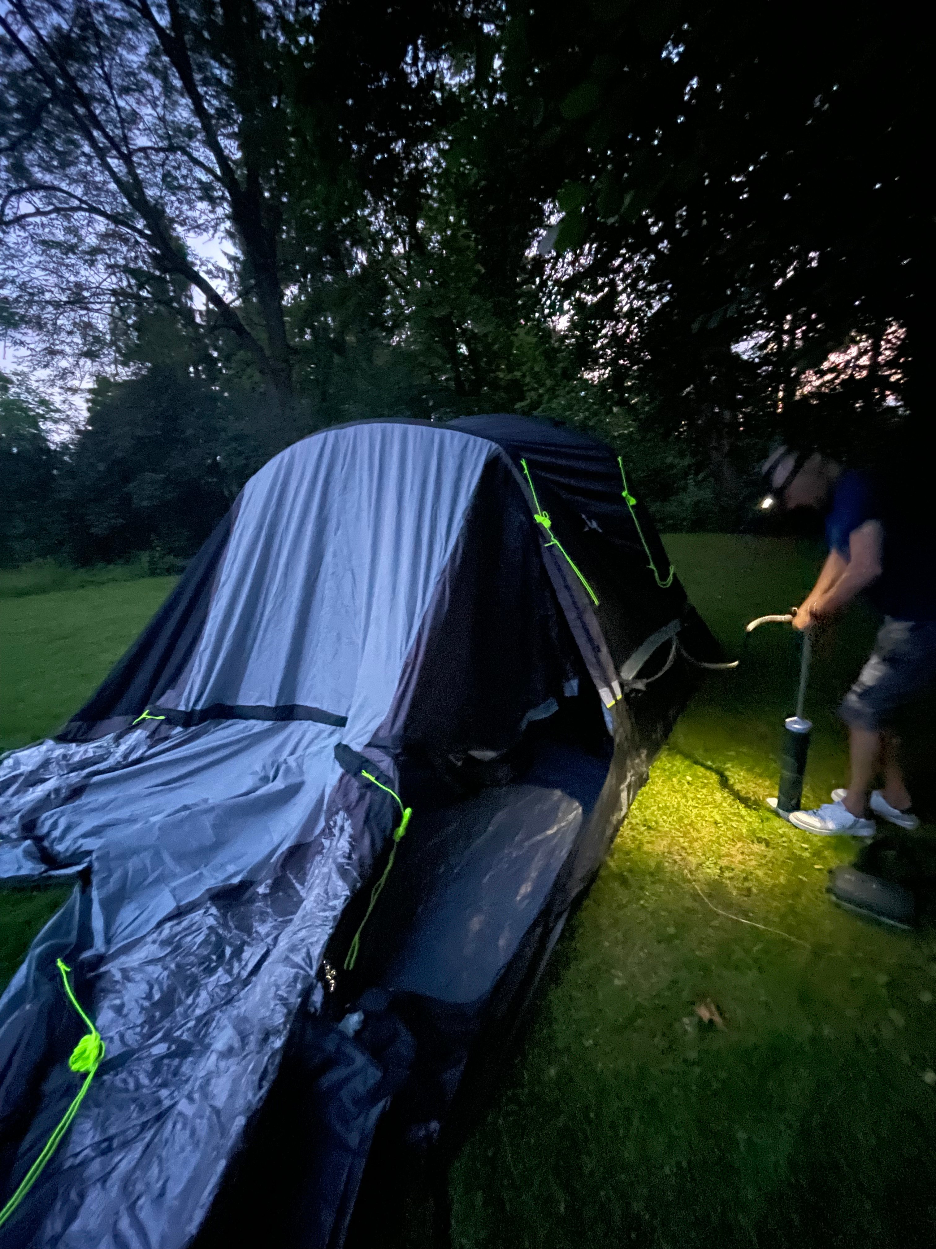 Esta tienda, avance o toldo tiene mangueras de aire hinchables en lugar de varillas.