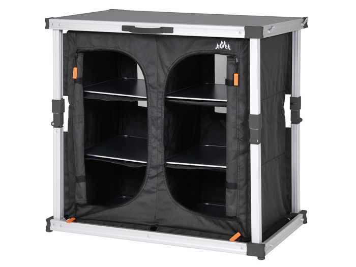 Este armario de camping tiene seis superficies en las que puede guardar todos sus utensilios. La parte trasera tiene una parte con mosquitera, lo que se encarga de que el armario esté bien ventilado.