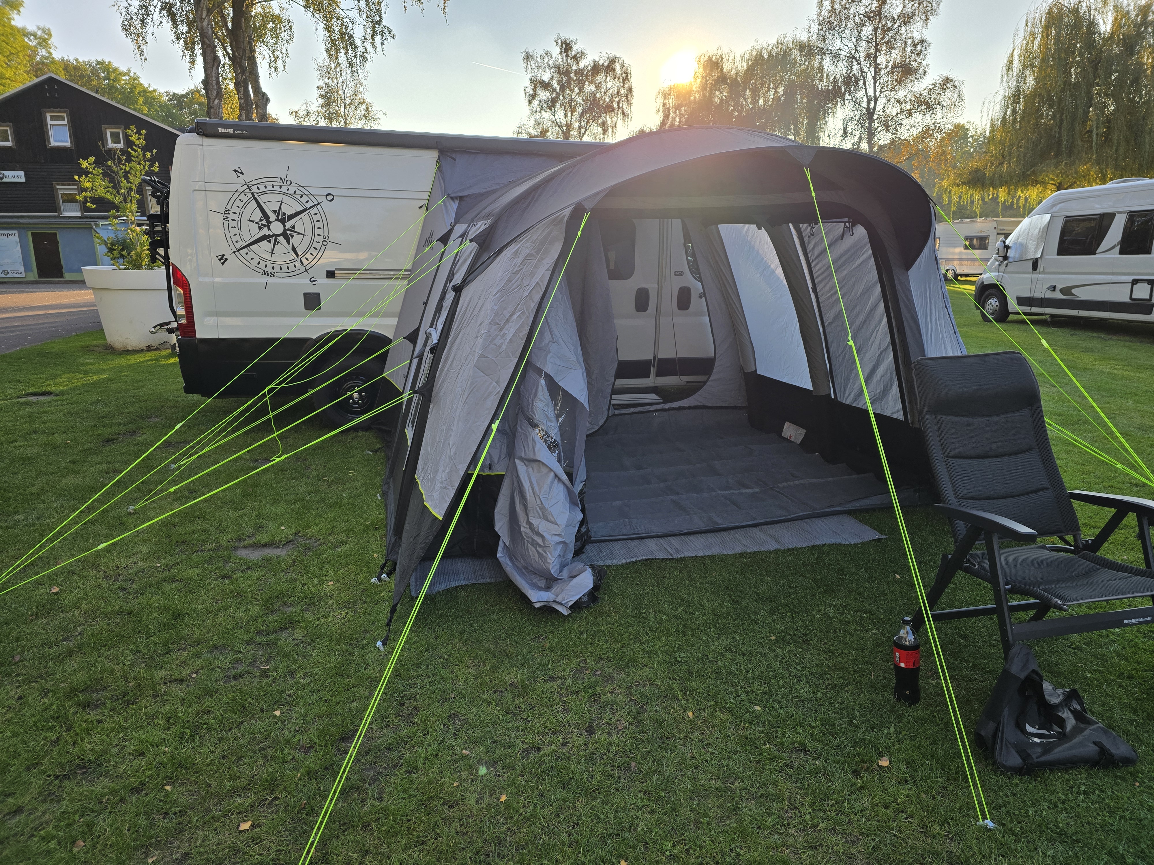 Este avance para campers tiene una superficie habitable de nada menos que 230 x 320 cm y un toldo de 90 cm de profundidad, mucho más espacioso que la mayoría de los demás. Así, cuando el tiempo no acompaña, puedes sentarte cómodamente dentro.