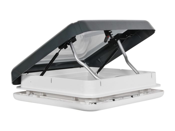 La cúpula es de una sola pared y se abre fácilmente con una palanca en el interior. Dos resortes de gas mantienen la trampilla abierta. ¿Solo quieres ventilar? Entonces también puedes fijarla en la posición de ventilación.