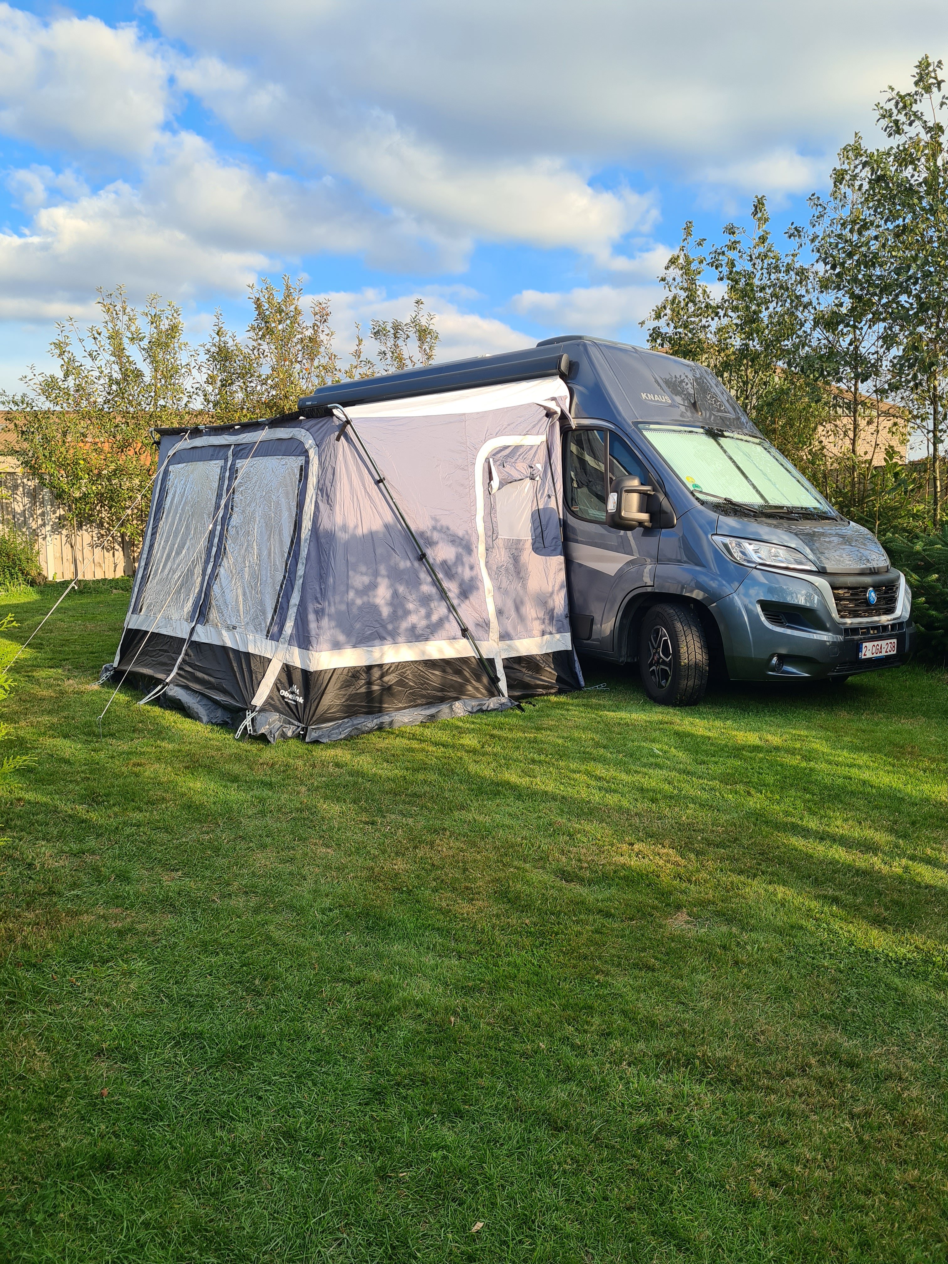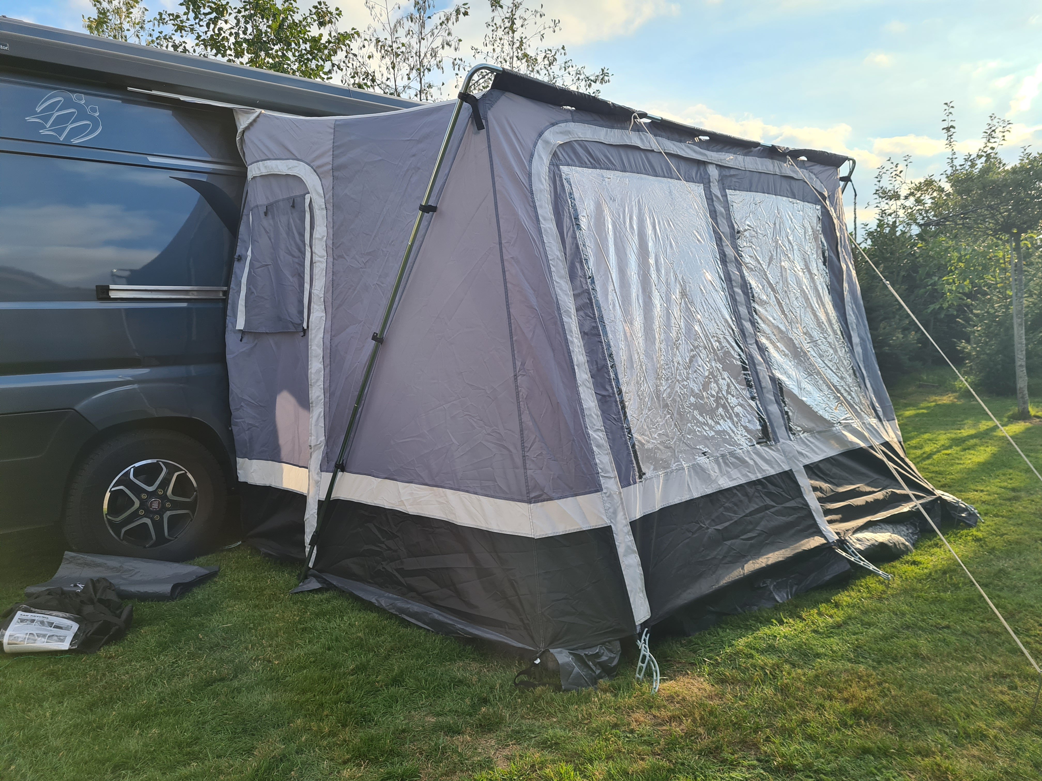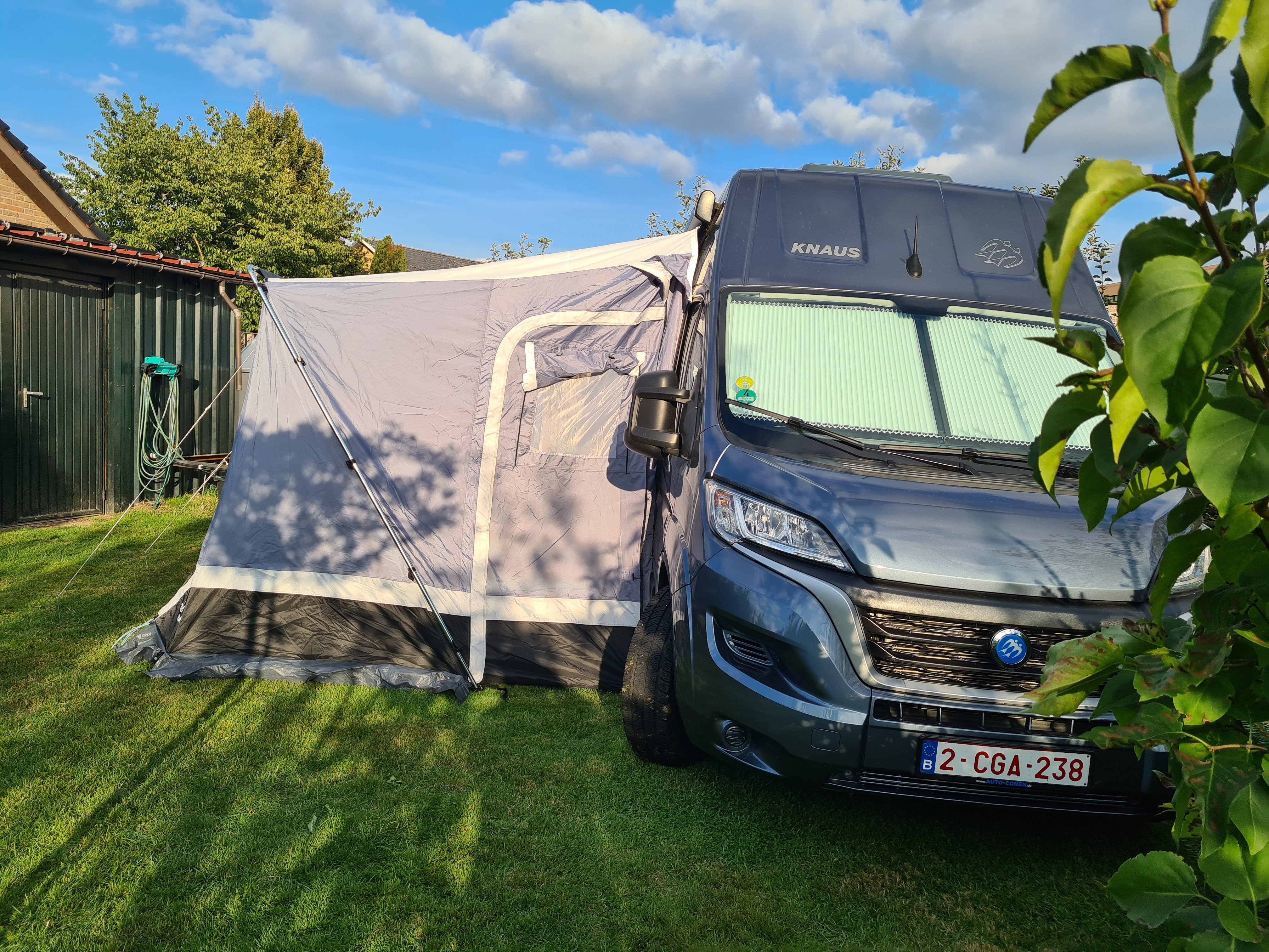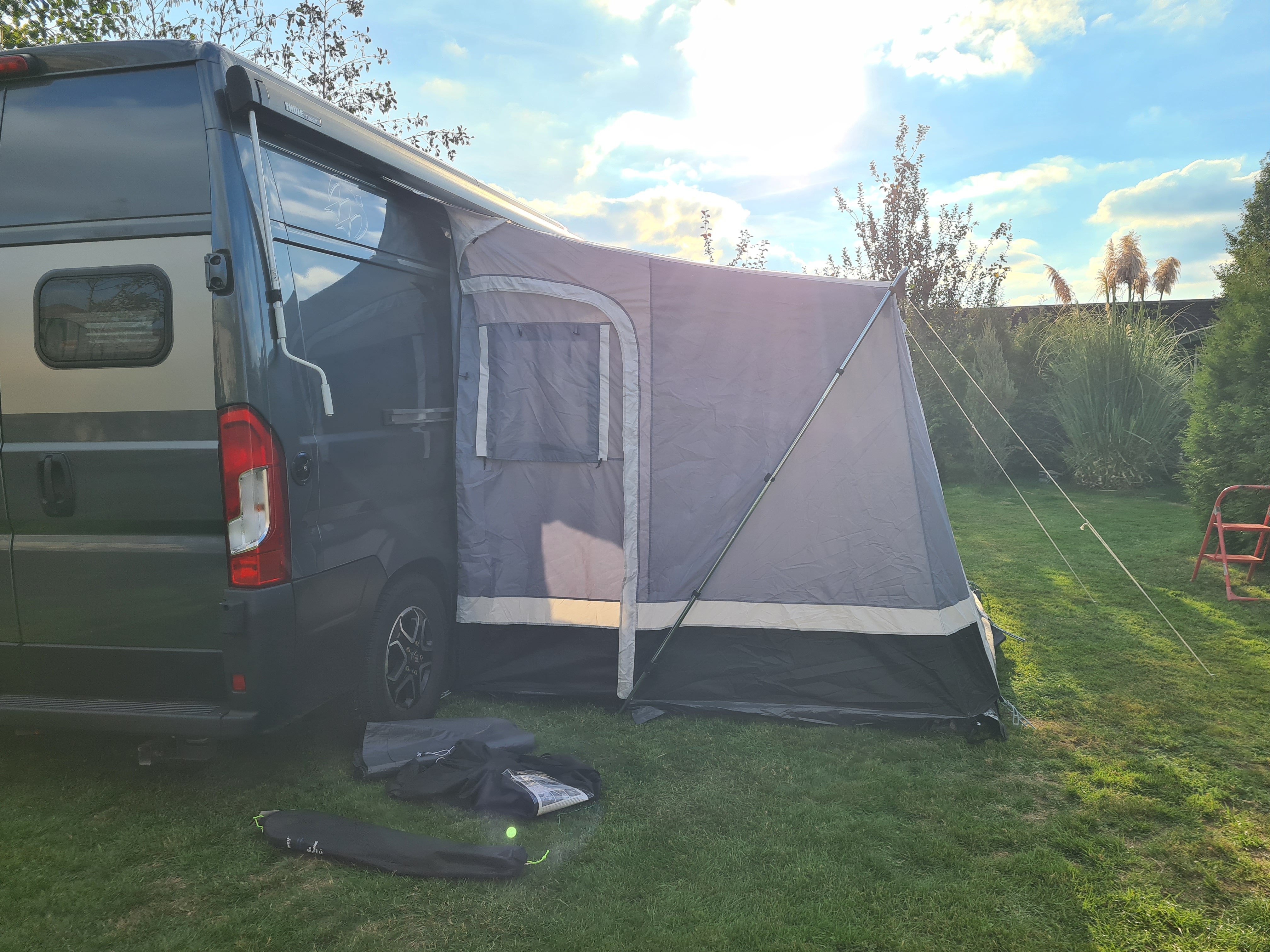 Los vientos tensores, las piquetas, la lona de suelo, el faldón bajo y el cubre ruedas, así como una práctica bolsa de transporte, se entregan de serie. Hay almohadillas de espuma cosidas al avance y se pueden fijar con las piquetas para que haya una buena y firme conexión con la pared de la caravana y así evitar las corrientes de aire.
