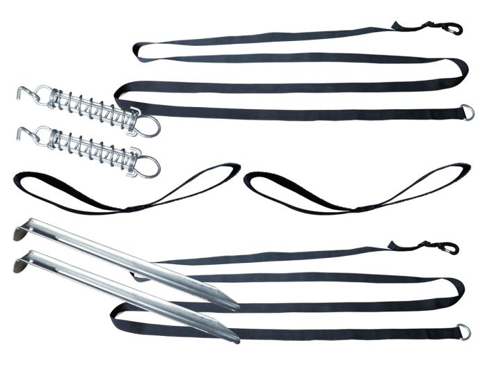 El Obelink stormkit cinchas antitormenta está hecho especialmente para tiendas familiares, tiendas tipo cúpula y tiendas tipo túnel. Con este set sustituye los vientos tensores existentes por cinchas antitormenta más resistentes. Sólo tiene que quitar los vientos tensores de la tienda y a continuación, colocar la cincha antitormenta con el gancho en el bucle donde normalmente se pone el viento tensor.