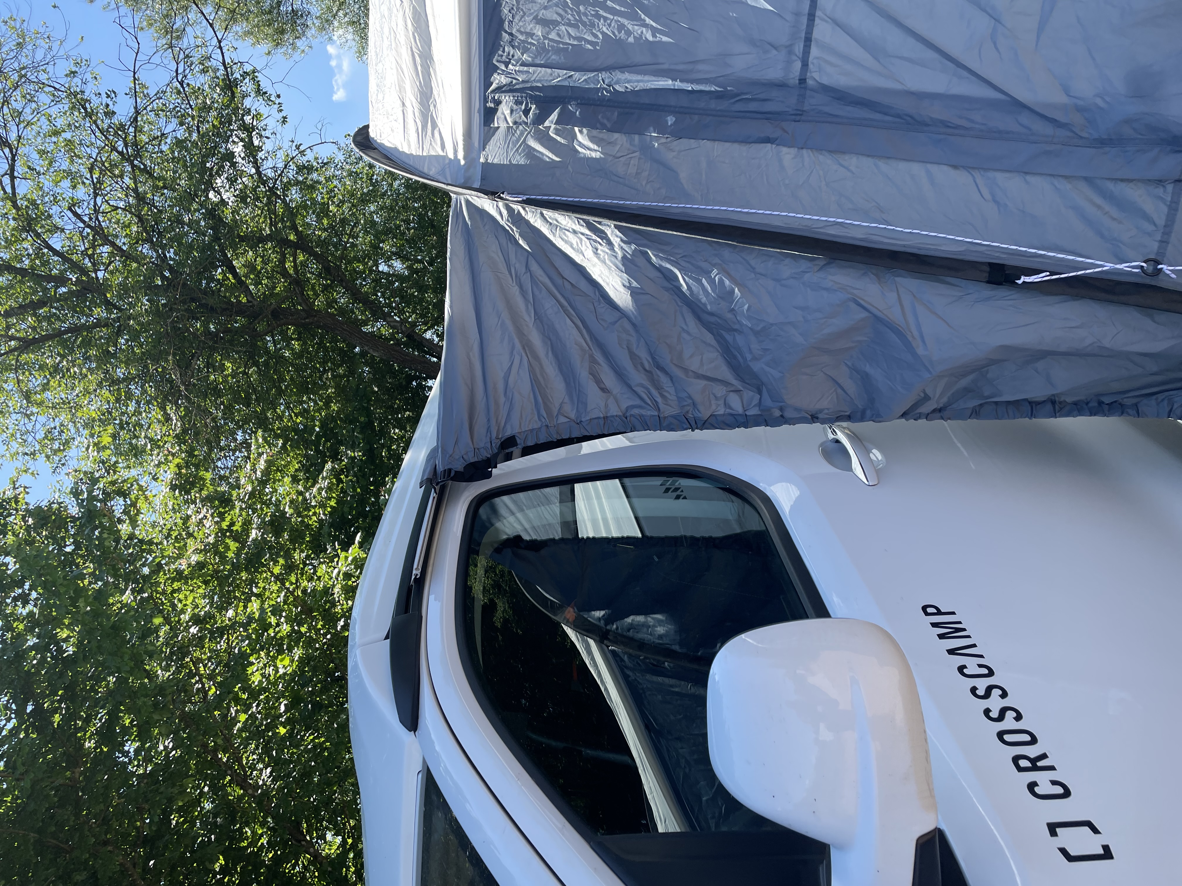 Si hace calor, buena ventilación es muy importante. Por eso, el Trinity tiene una gran ventana en la parte izquierda con mosquitera hasta la mitad y si quiere tener más aire, puede enrrollar del todo la parte derecha.