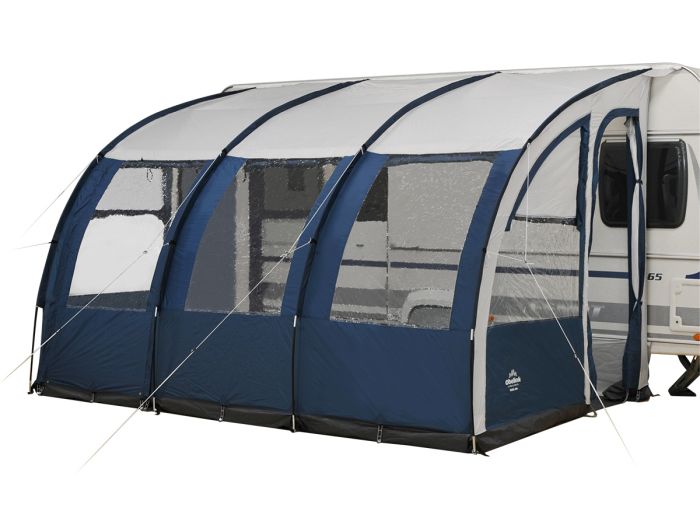 El Obelink Viera 390 tiene ventanas grandes que proporcionan mucha visibilidad y luz. El frontal izquierdo se puede enrollar hacia arriba y además puede utilizarse como toldo. Los laterales tienen práctica puerta doble con mosquitero.