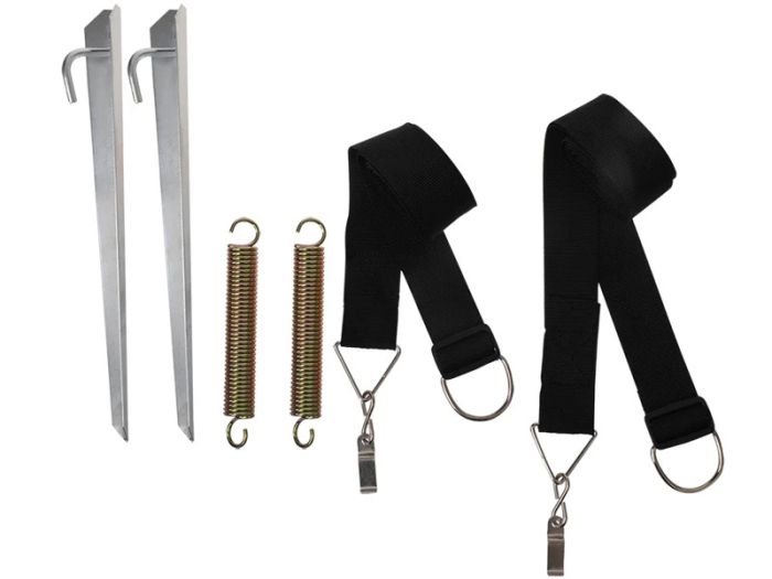 El set consta de 2 cinchas antitormenta, incluidas las piquetas y los muelles.