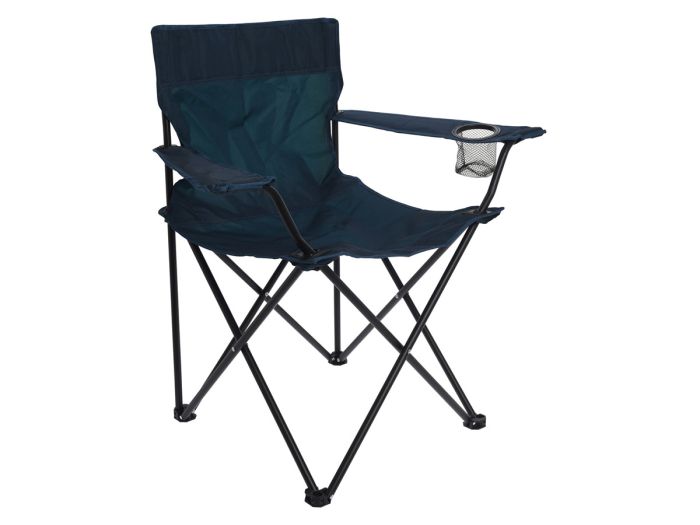 Esta silla plegable tiene un tamaño desplegada de 51 x 42 x 81 cm y tiene portavasos y apoyabrazos. La silla tiene un marco de acero liviano pero muy estable y la lona del asiento es de poliéster.