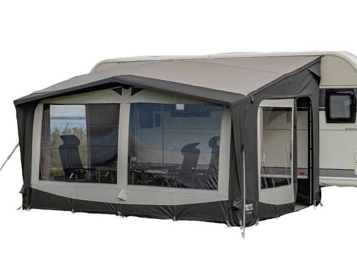 El avance Estate 390 de Telta es accesible y fácil de usar que gracias al saliente del techo tiene un aspecto tradicional y acogedor. A pesar de su diseño sencillo y aparentemente simple, todo está pensado al detalle. Por ejemplo, todos los paneles son completamente desmontables con la cremallera, por lo que el avance se puede convertir en un abrir y cerrar de ojos en un toldo para los días soleados de verano. Gracias a la parte delantera extra alta, hay suficiente altura para estar de pie en todas partes. Las grandes ventanas tintadas proporcionan luz y privacidad. Para una privacidad total, todas las ventanas se pueden cubrir desde el interior con las cortinas incluidas.