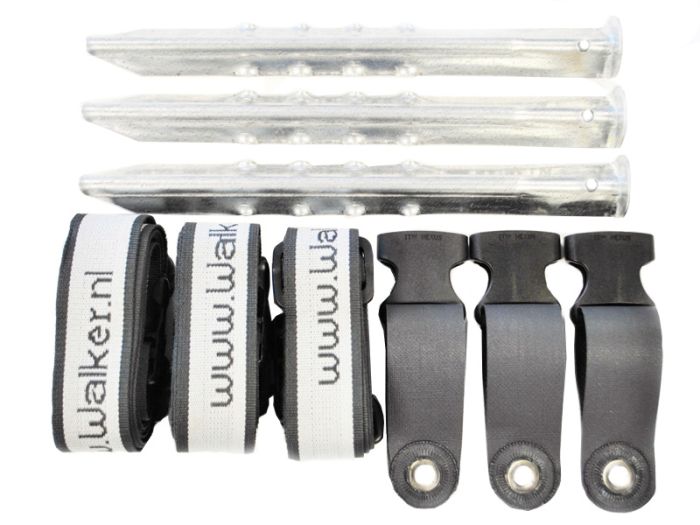 El set de cinchas antitormenta de 3 piezas Walker Easy-Lock es un set con cinchas antitormenta diseñado específicamente para los avances y toldos Walker.